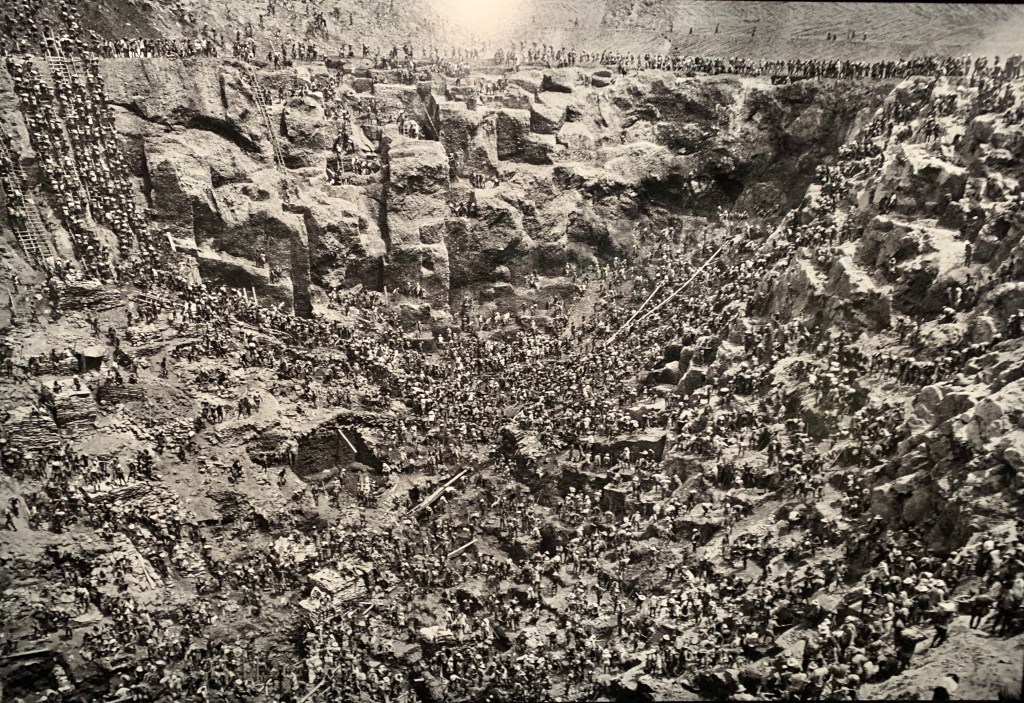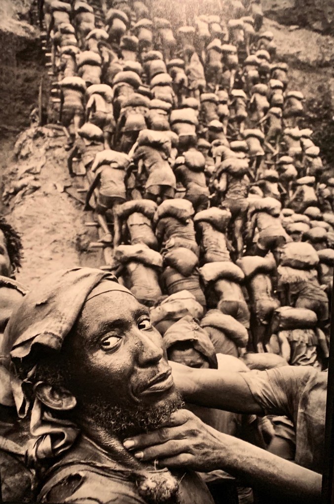 See on üks teostest, mis oli näitusel. Teose autor on Sebastiao Salgado, aga teosel puudub nimi. Alguses peale vaadates ma märkasin mitme kümneid inimesi, kes olid pressitud tihedalt kokku, samal ajal kandes kottide viisi kive. Alles paari sekundi pärast ma märkasin, et allpool olevat meest, keda kägistati. Kohe läks juba niigi õudne vaatepilt veelgi õudsamaks. Mida kauem ma vaatasin, seda kõhedam mul hakkas, sest mehe nägu on täiesti rahulik nagu see oleks igapäevane. Hakkasin spekuleerima kas ta oli üks õnnelikest, kes ei pidanud minema kivikotiga ülesse ehk äkki leidis ta kulda ning seda proovitakse temalt jõuga ära võtta või oli see politseinik, kes kasutab enda jõudu ta peal. Teosele annab juurde, et see on must-valge (kuigi mu kaamera ja toa valgustus oli selle muutnud rohkem mulla värvi), sest see toob jõhkrust pildile. Loomulikult on see autori käsikiri, aga sellel teosel tumeduse kasutamine toob eriti vilja. See teos pole nii ruumiline nagu teised teosed näituselt, aga see võtab kõige paremini elu Pelada kullakaevanduses kokku. Käed kaelal ehk vägivald, redelitest üleskõndimine ehk raske töö tegemine enda parema tuleviku nimel ning mehe rahulik nägu, mis näitab leppimist ja harjumist olukorraga. Ma arvan, et kunstnik tahab tuua lihtsalt esile probleeme, mille all arengumaa rahvad kannatavad. Minu jaoks ta proovib laiendada meie silmaringi ning panna meid väärtustama, mis meil on ja kui palju meile on antud, sest nendele inimestele ei ole antud palju ning enamus neist ei saavutanud palju.